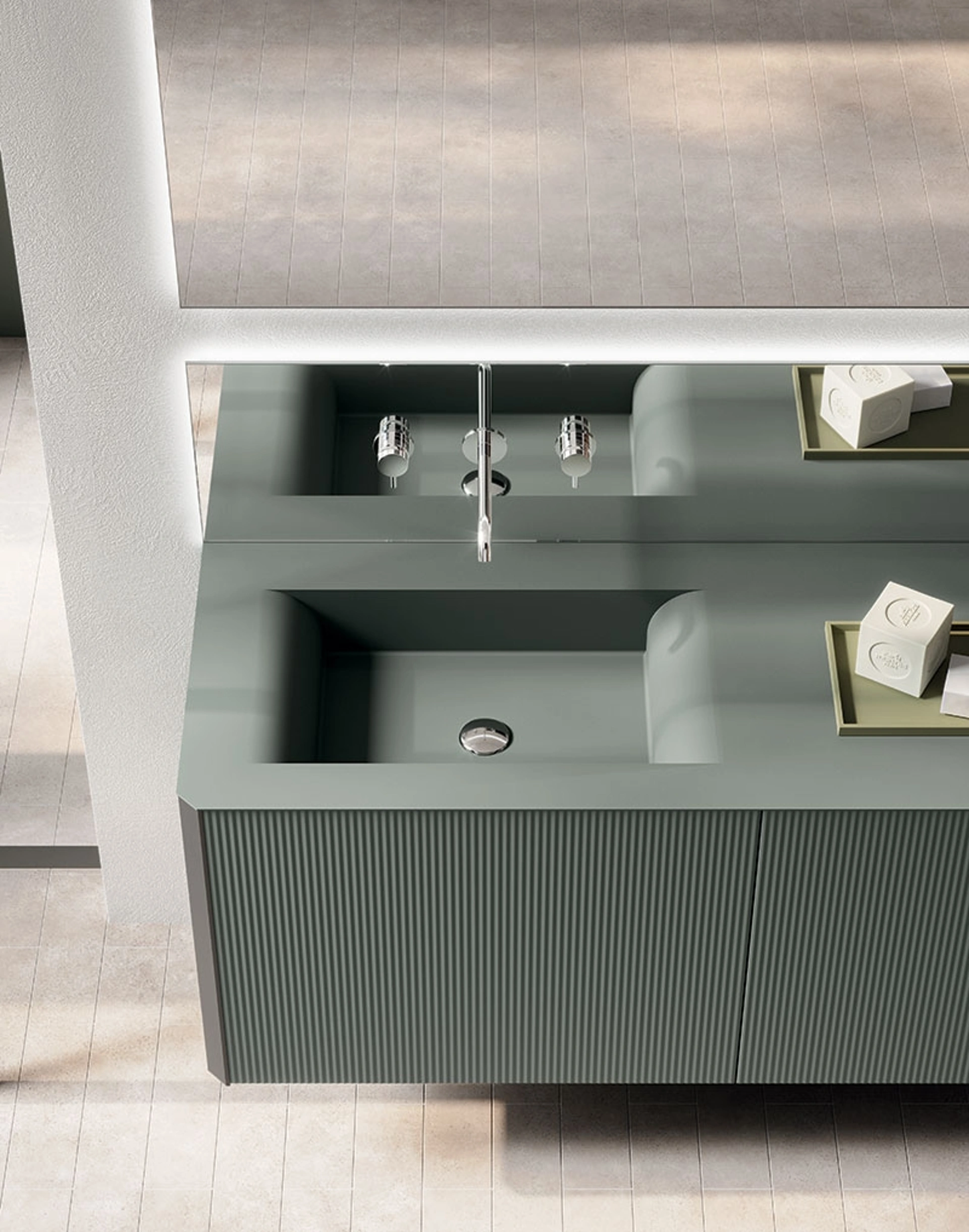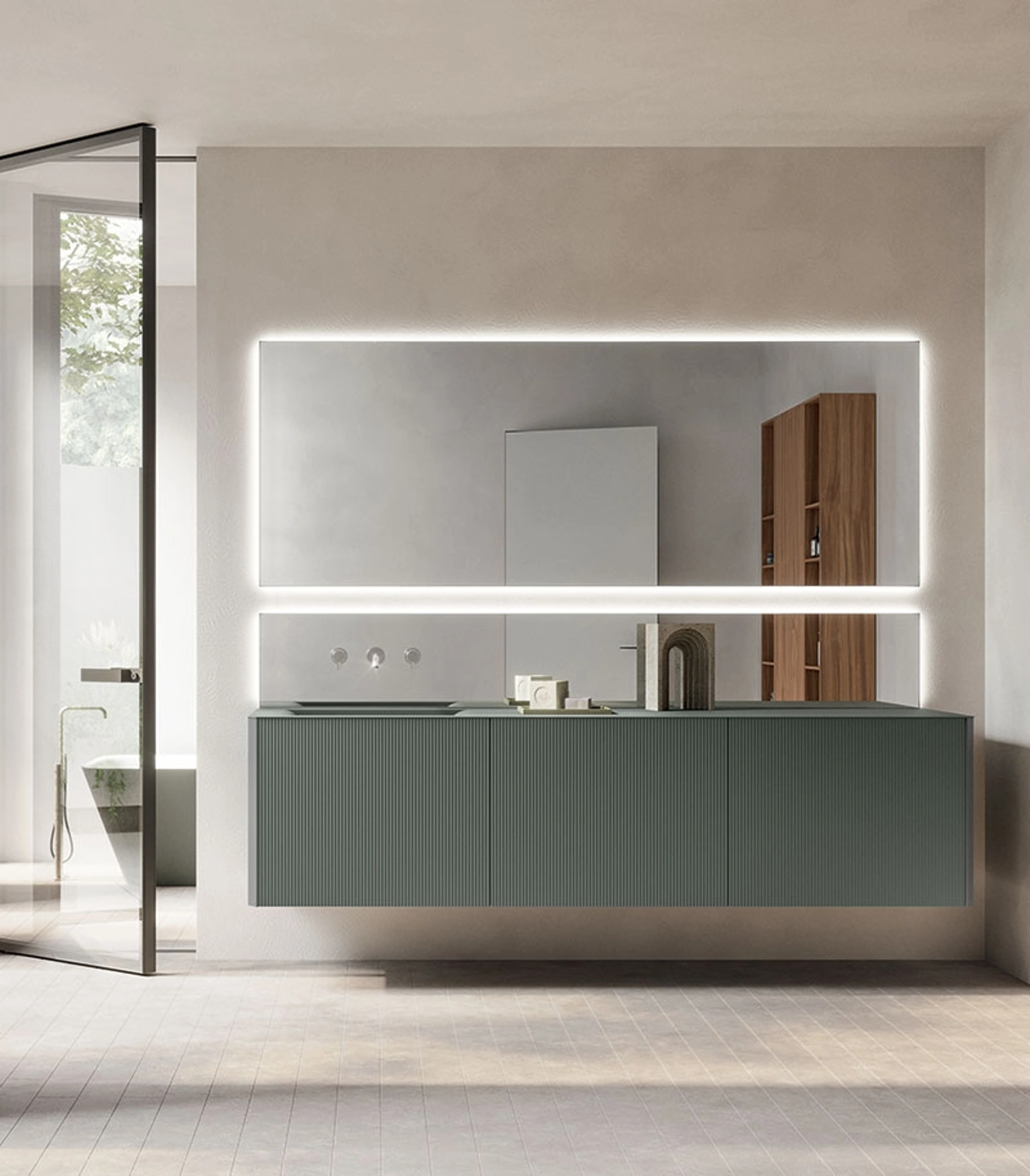 Arreda il bagno di casa moderno perfettamente con Honey 02, mobili bagno sospesi e oggetti in laccato opaco di Cerasa.
